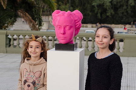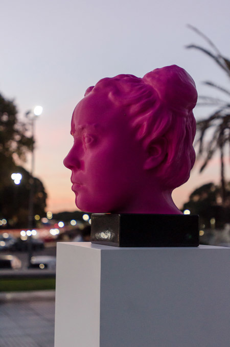 El busto es fucsia y el color resalta entre las plantas, los árboles, el cielo y el cemento. Es el monumento de una millennial, hija de la estridencia de internet. Victoria transforma su cuerpo en datos y después lo vuelve a materializar en un monumento público digital.