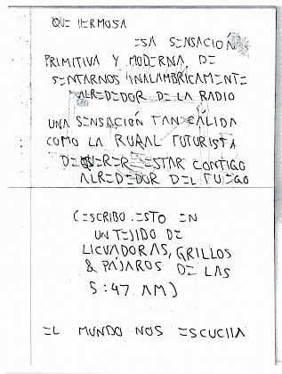Creo que tiene algo de místico todo esto. A veces sucede que todo mundo te puede repetir las mismas cosas, pero llega alguien que encuentra otra forma de decirlo que nos atrapa. Creo que eso tiene que ver con que no solamente hay que esperar el mensaje correcto, sino a quien lleva el mensaje, también. Comencé una investigación sobre tradiciones orales para la investigación del archivo y estas conversaciones cobran tanto sentido.... Algo que me encanta de la tradición oral es poder comparar lo que se dice de lo que sucede. Es decir, hay un espacio muy largo para la forma en cómo contar las cosas, sin embargo se sigue mostrando algo de la realidad que somos. Muy parecido al arte.