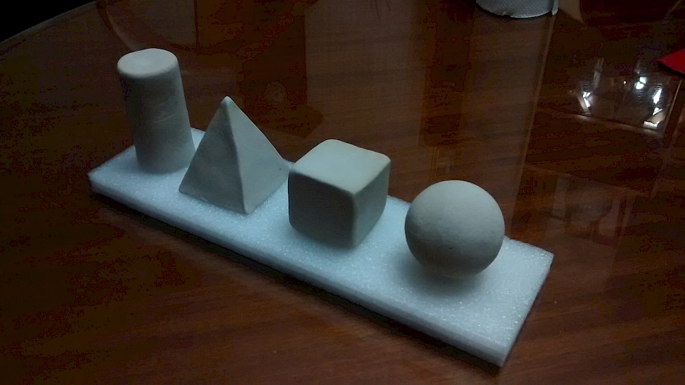 Cilindro, pirámide, cubo y esfera moldeadas a mano en arcilla sobre base de polipropileno