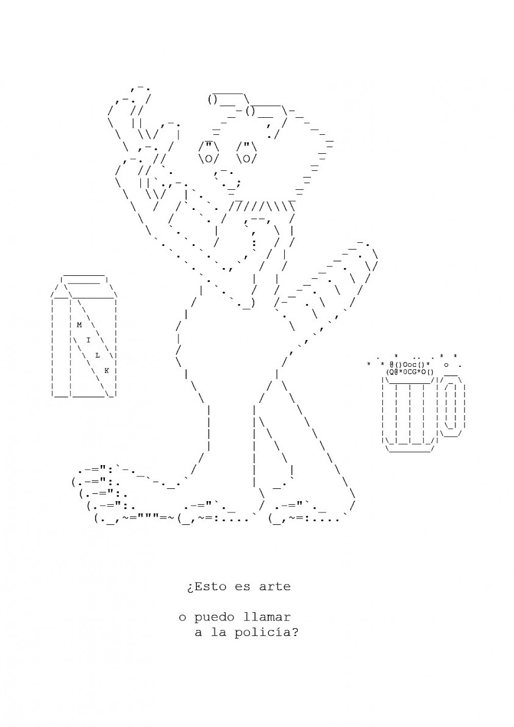 una lamina comestible - una sábana transpirada – una palabra mal escrita - una frase mal entonada – un cuerpo continuo como una cinta mecánica – un puchito – en aserrín en MDF – injertos y bulbos en mazapán – colgantes de ananá - una oreja térmica – una mamadera arrollada - una lámina transpirada - la conciencia de un Eva – y leche volcada - LCL – RCA fideos de crealina – MCM - monitores internos con terminaciones - MDA - PDFs de tierra o de arcilla un sofá virtual – cáscaras de porcelana – bananas de material – cerebros de porcelana – palmeras de material – cascadas de porcelana, oxigenadas – pelos de poxiran - cerveza Dia% virtual